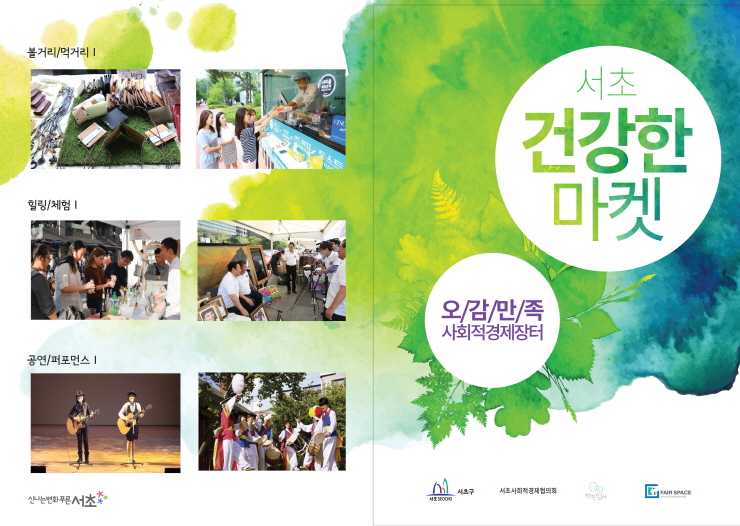 서초구청 광장에서 오감만족(보다, 듣다, 맡다, 맛보다, 만지다) 사회경제장터 "서초 건강한 마켓"개최를 합니다. 사회적경제 제품인 패션 액서리,패브릭, 생활잡화등을 전시,판매하며 유화사진, 천연염색, 다도등의 다양한  체험을 할 수 있고 여러유기농제품들과 푸드트럭을 통해 먹거리들을 맛볼수 있습니다.