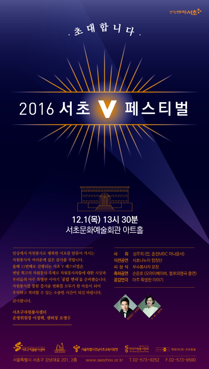 ❍ 장 소 : 서초문화예술회관 아트홀 ❍ 일 시 : 2016.12.01(목) 13:30~16:00  ❍ 내 용 : 축하공연, 축사, 표창장 수여, 연극 등 ❍ 주 최 : 서초구자원봉사센터